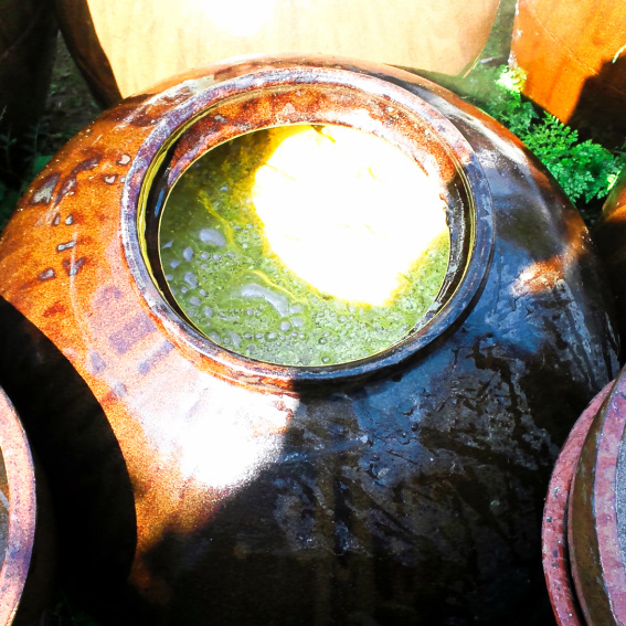 ・創業200年、伝統的な露天に甕(かめ)を置き、その甕の中に、国産の蒸発芽玄米、発芽玄米で造られた米麹、地下水を入れて自然発酵、熟成させた黒酢になります